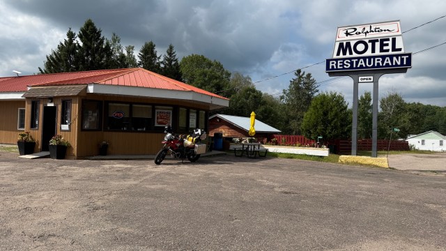The ride was going well and by the time I got to Rolphton, I was ready to lose the rain jacket. After fueling up, I parked in pretty much the same spot in front of the restaurant as I did on my way out east. This is a great stop. With a restaurant, fuel AND a motel, you really can’t go wrong. It’s right on the 17 (Trans Canada) about half way between Ottawa and North Bay. I didn’t need the motel, but it’s good to know where it is if I need it next time ;)