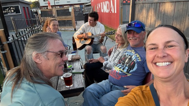 Upon ordering my second beverage, I noticed some folks wandering outside with their drinks. Always an eager explorer, I grabbed my drink and wandered through the door too. To my delight, there was a lively patio filled with people visiting, laughing, and having a wonderful time. I saw a table of folks and sauntered over to say hello. They very happily obliged when I asked if I could join them. We got to talking and Dan exclaimed, “Hey! Are you the one with the bike?”
