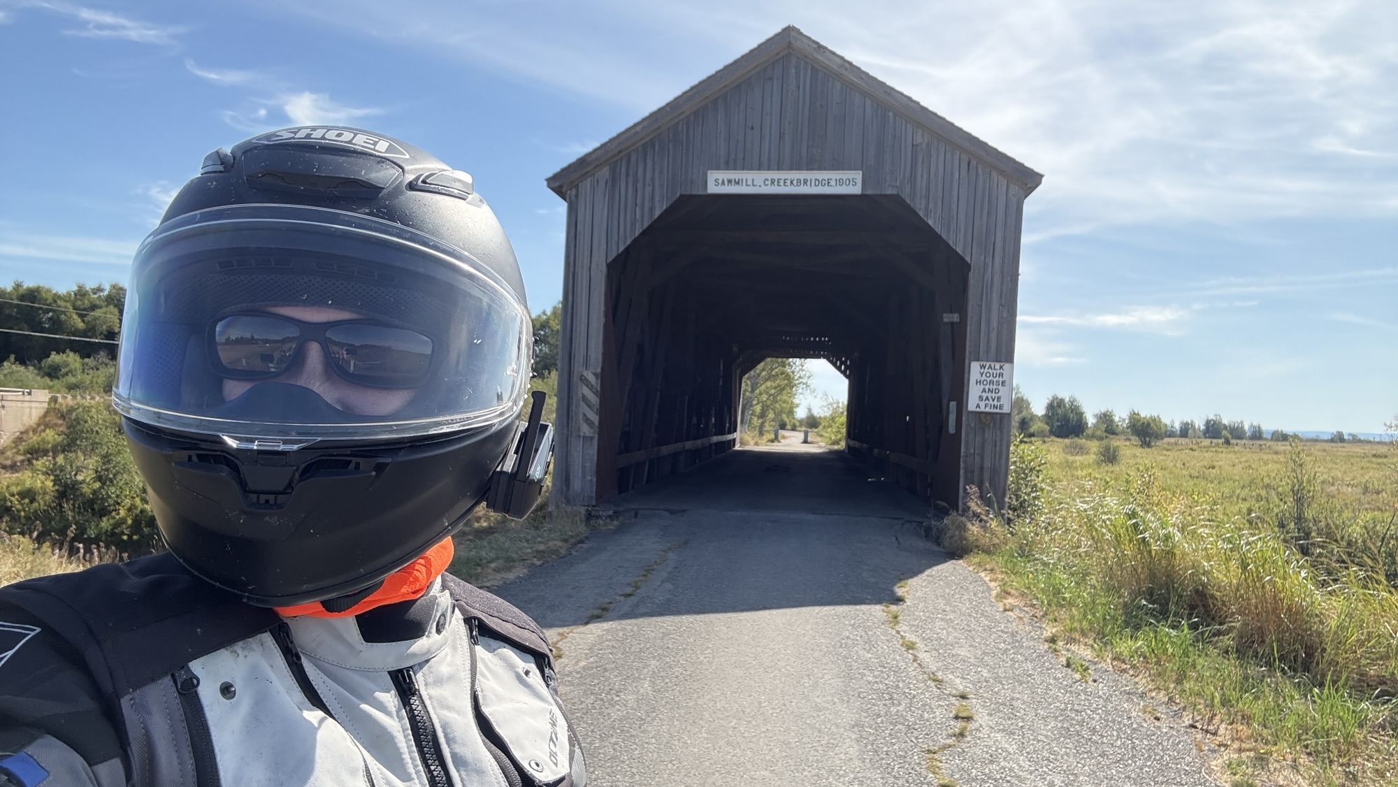 The 114 heading west was such a pretty ride! For a goodish while it ran along the coast and the views were so beautiful. I came across a covered bridge, zipped in and effortlessly angled Jules and The Gang for a photo. Remember my frontal lobe freak out on the course? Those memories prevent me from doing things like zipping down a dirt lane from time to time. The PTNJ (Post Traumatic Napping Jules) can be real, my friends! I was quite tickled with myself that I hadn’t even given it a second thought this time. I know. It doesn’t look sketchy at all, but the dirt trail from the highway to this little lane was not much more than a cart path.