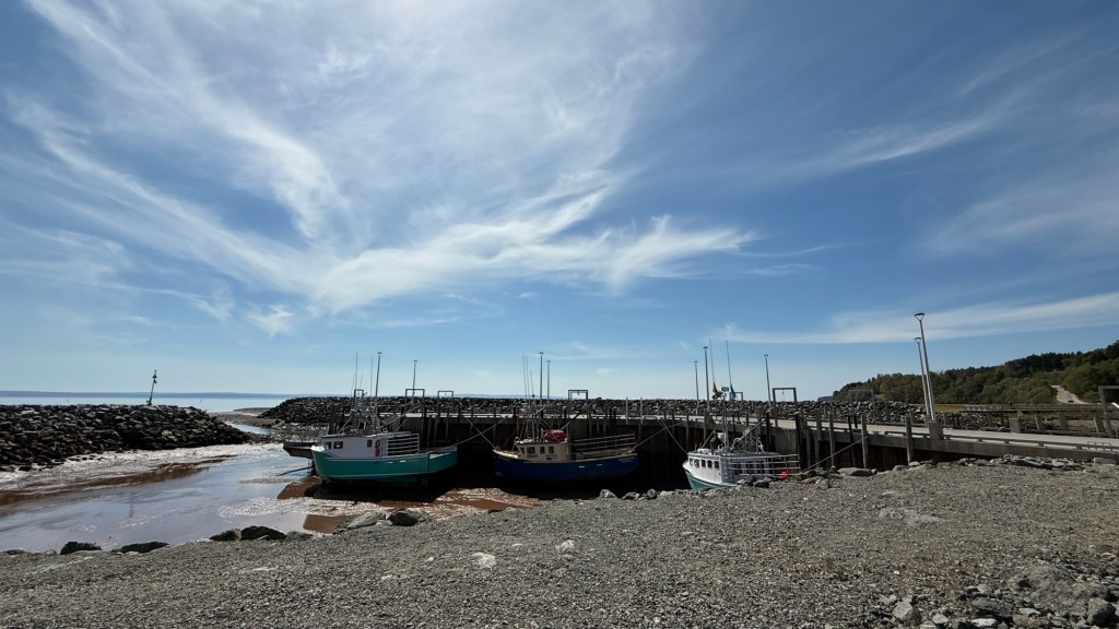 When I got to Alma, I fueled up and had the most amazing seafood chowder across the street. It was a hotel with rooms and a restaurant overlooking the sea. It was a pretty spot for sure. I kind of laughed about the boats sitting on the ground here because it was no low tide. Ah well. Hopefully I get back this way to see the Hopewell Rocks before the crumble to the sea!